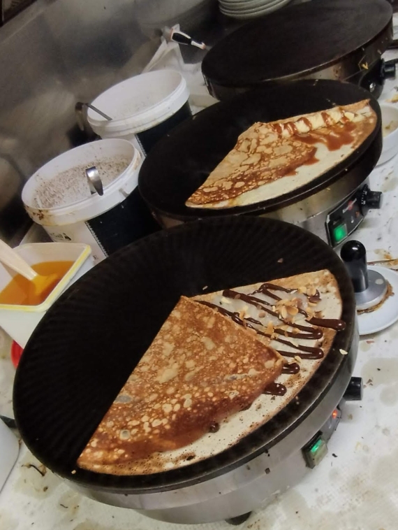 Crêpes salées garnies de produits frais, crêpes sucrées gourmandes, cocktails colorés et cidres bretons servis avec soin.